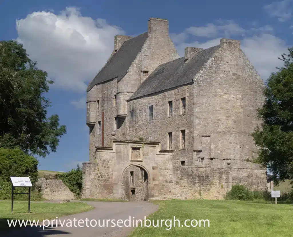 Midhope Castle Outlander tours of Scotland . To avoid booking fees for tours of Scotland you can make a booking by phone / WhatsApp on +447305294773 or contact us onlineTwo-storey bartizans crown three of the corners, although their conical roofs have gone, a caphouse for the stair crowning the fourth. The roof is steeply pitched. The tower forms one side of a courtyard, and there is a fine walled garden and a 17th-century lectern doocot .