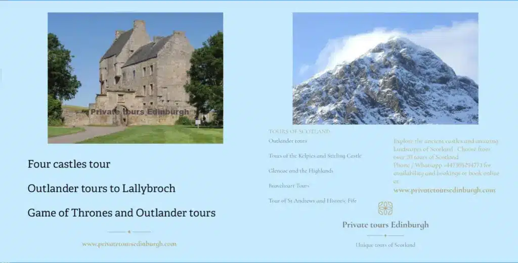 Five Outlander tours of Scotland . To avoid booking fees for tours of Scotland you can make a booking by phone / WhatsApp on +447305294773 or contact us online